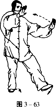 2. 图 3-64图 3-64右腿屈膝提起,身体右转,右脚向右前方迈步,先以 脚跟着地,然后全脚踏实,右腿屈膝前弓,左腿伸直,成右弓 步;同时两掌右上左下弧形分举,右臂伸直,掌心向上,掌指 向右前上方;左掌置于左胯外侧,掌心向下,掌指向前,臂微 屈;眼看右前方(图3-65?67)。