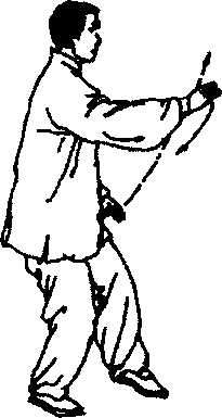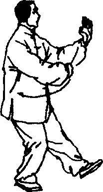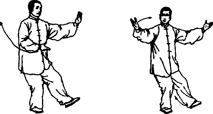 4. 左臂屈肘,左手经左耳侧向前推出,掌心向前,掌指 向上;右掌心翻转向上撤至右肋侧;同时身体右转,右脚轻轻 提起,向后(偏右)侧退一步,先脚尖着地,然后慢慢踏实, 重心移在右脚上;左腿随着转体以脚掌为轴自然转正成左虚 步;眼看前方(图3 - 81?83)。