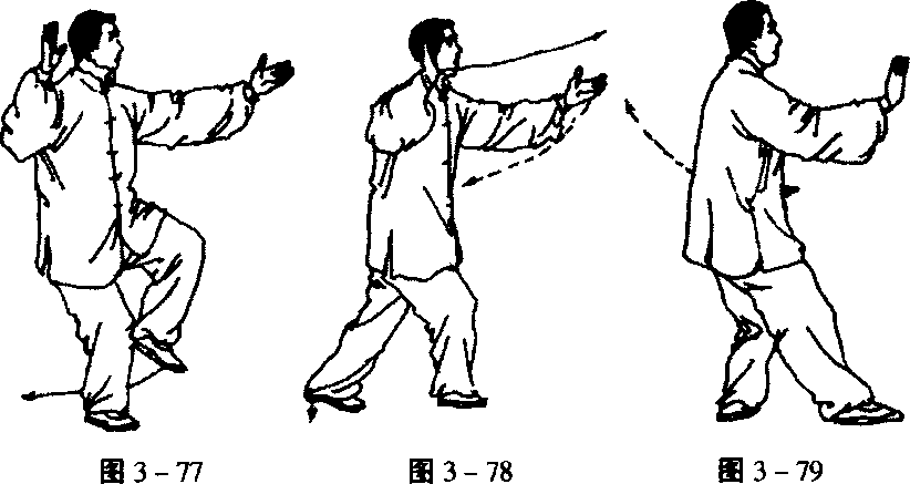 向上;左臂屈肘后撤至左肋外侧,掌心向上;同时身体左转, 左脚轻轻提起,向后(偏后)侧退一步,先脚掌着地,然后慢 慢踏实,重心移到左腿上;随转体,右脚以脚掌为轴转正,成 右虚步;眼看前方(图3 - 77 ~ 79)。