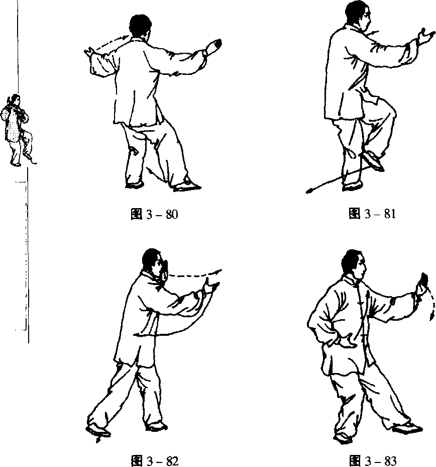 3. 上体微左转,左掌随转体向后上方弧形平举,掌心向 上;眼看左后方(图3-80)。