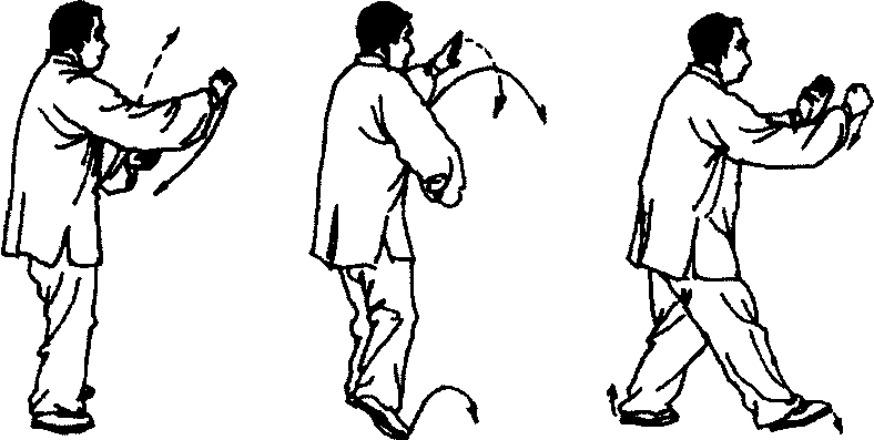 身体左转,左脚外撇,右拳下落至胸前;重心移于左腿, 右脚跟抬起;右拳下落至腹前;左拳变掌向左上方划弧;右腿 提起向前迈步,脚尖外撇,同时右拳向左下、向里、向上弧形 向前搬出,左拳自前而下弧形移至胸前,掌心向右,掌指向 上;眼看前方(图3-222?224)。