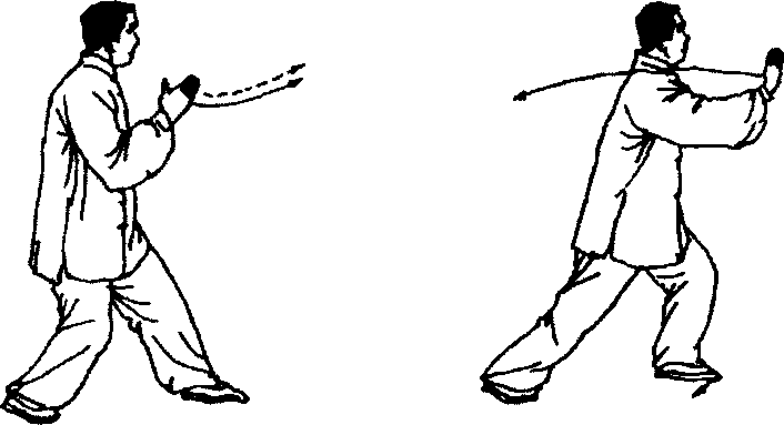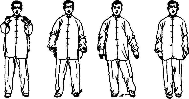两掌分开和合抱时,上体不要前俯;右脚收回时,脚尖先 着地,然后全脚着地,身体要自然中正;头要微向上顶,下须 稍向后收;两臂环抱时需圆满舒适,沉肩垂肘。