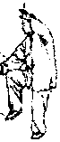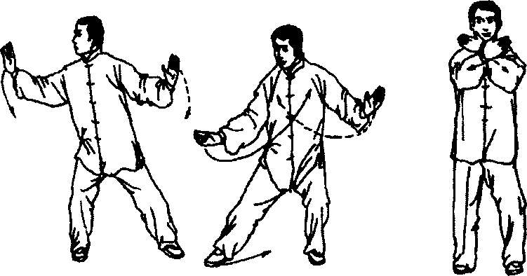 2.身体左转,右脚向左脚移步,成小开立步;同时两手 向下、向里弧形交叉抱于胸前,右手在外,两掌心向里;眼看