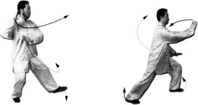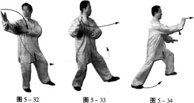③ 各动必须以腰为轴,两臂动作必须与提脚迈步、转腰、 向前弓步协调一致,做到上下相随。
