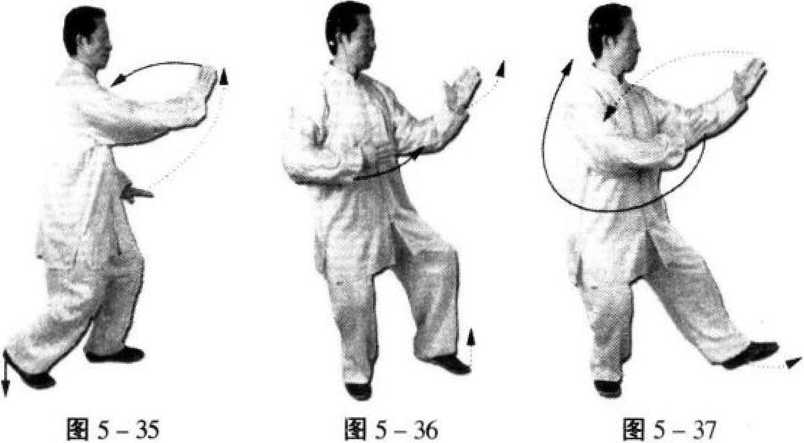 扣,重心移至脚跟,转动腰、靛带动进步,这是杨式太极拳与 其它流派太极拳不同之处。