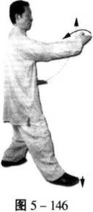 5. 右小腿回收,然后再向右前方迈出,重心前移;同时 左掌从左向里划弧,手心向下,经右前臂内侧上方向左斜前方 划弧推出,掌心向下;同时右臂外旋,向里回收至左肘内侧, 掌心向上;眼看右前方(图5 - 146、5 - 147)。
