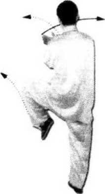 ① 初学者转体时,由于右腿支撑不稳,可随转体左脚在右 脚后20厘米处点地,待动作纯熟与支撑腿稳固后,可左膝收 回,随身体向左后转体135度;转体时,左脚要提住,膝关节 不可下落。