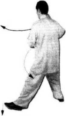② 左脚蹬出,要以脚跟为着力点,蹬脚方向应是正西。