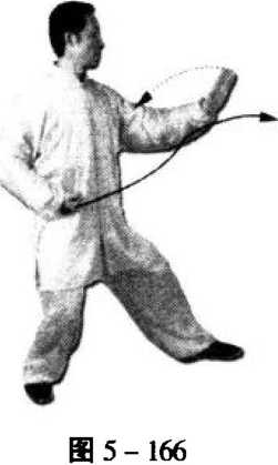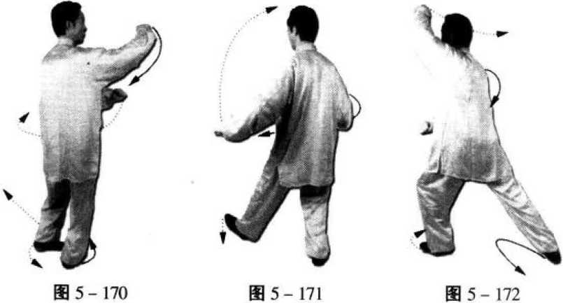 1. 左脚尖里扣135度左右,重心全部落于左脚;左拳向 左划弧至左侧上方,拳心向外,拳眼斜向下;右拳向左下划弧 至肋前,拳心向下,拳眼斜向里;同时右脚收起再向右侧方迈 步,脚跟着地;眼看左拳;随右转体,右拳向下划弧平举于身 体右侧,拳心向下,拳眼向左;左拳随转体下落于身体左侧, 拳眼向右(图5-173、5 - 174)。