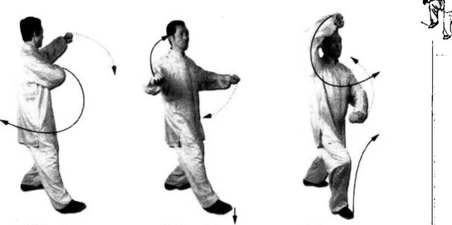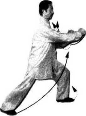 1. 右脚收回落于左脚前方一脚远处,脚跟着地,与左脚 平行,右脚尖里扣45度左右,重心移于右脚,上体微向右转;