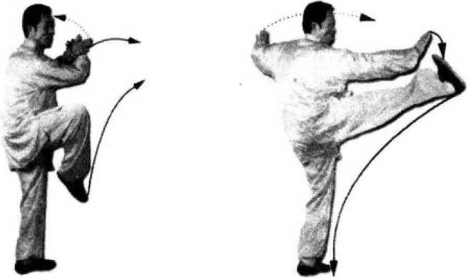 ① 右蹬脚后下落时,左腿相应的下蹲, 地,这样才能做到轻灵圆活。