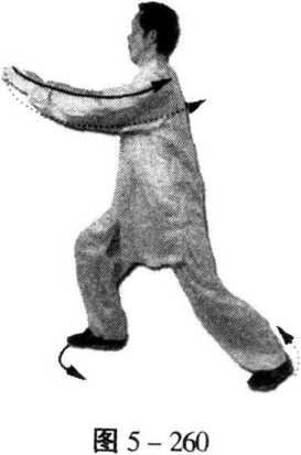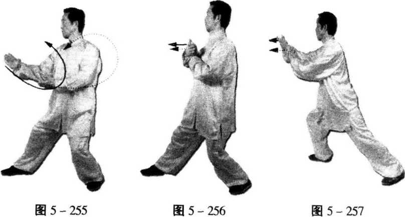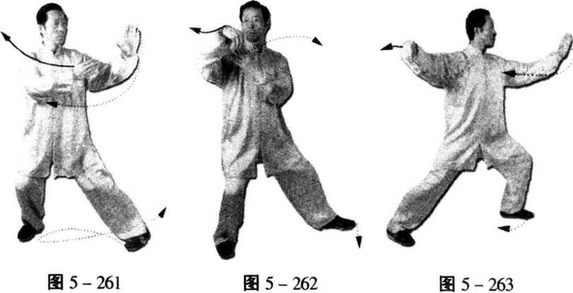 图 5 - 272 图 5-273 图 5-274图 5 - 272 图 5-273 图 5-274左脚内扣90度;右勾手向右后方微伸出;左掌而上、向右屈 臂落于胸前,掌心向右,掌指斜向上;眼视左前方(图5 - 275) o
