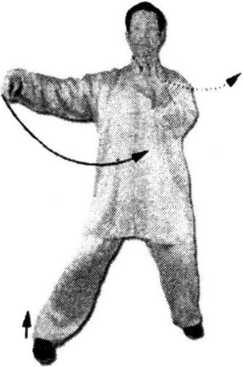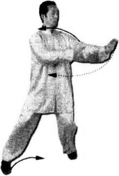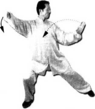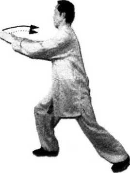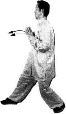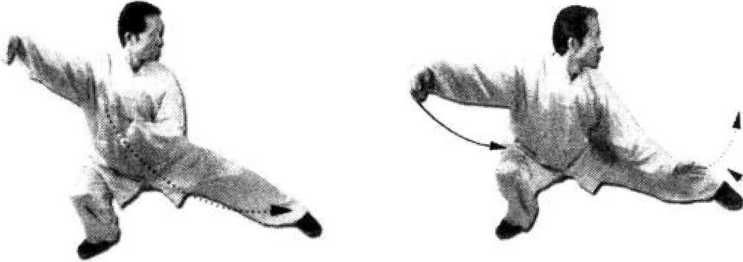 ③ 左掌划弧前穿时,要圆活自然,手指向前,掌心向外, 防止前俯低头。