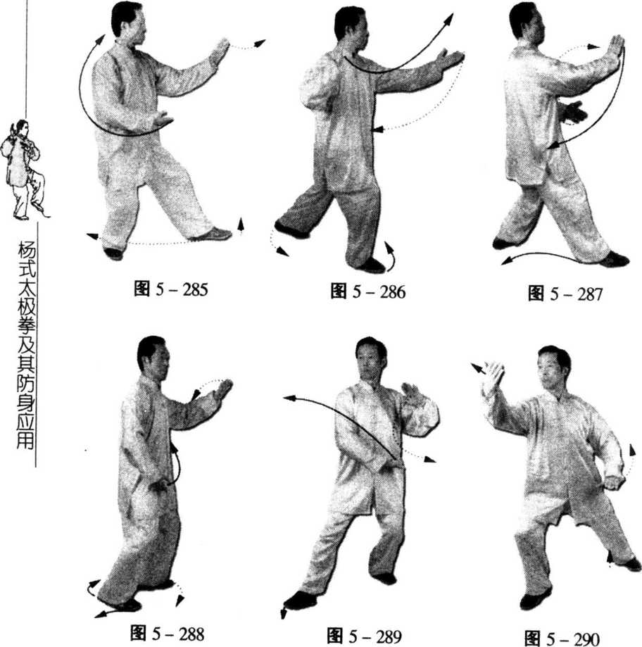 2. 以下动作与第十七式左右倒撵猴“右倒撵猴”动作2 相同,随后接“左倒撵猴”、“右倒撵猴”(图5 - 283 ~ 287)。