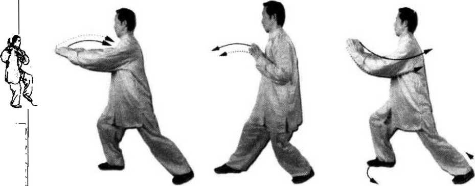 ③ 两掌移动,保持一定距离,要前手去,后手跟。“两膊 相系”,不松散。左掌与右勾手前后拉开时,要同弓左腿以及 转体动作协调一致。
