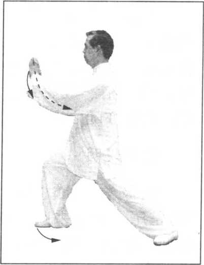 3. 挤的劲点在右前臂槌骨一侧,初挤时,左手 目标肘凹,随转腰势,慢慢弧形沿着右前臂,自肘凹 挤至腕部,挤出时左掌应虚贴右腕脉门。