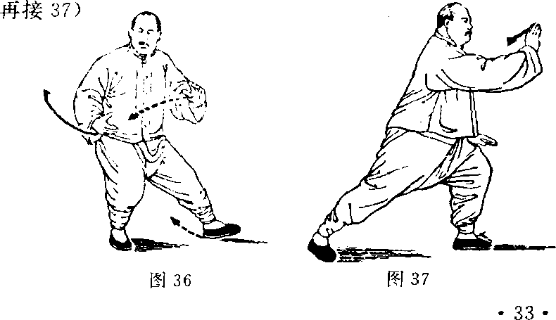 动作二、三:同前左搂膝拗步动作二、三。(接图31 — 32