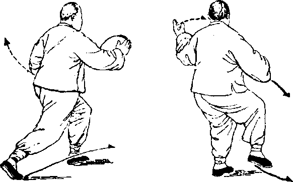 动作:重心渐渐全部移于左腿(如前所述,弓腿的一足 负担重心约百分之七十,要完全落实),右脚稍提起,向前距 原地一脚许落下,重心渐渐全部移于右腿,身体渐渐右转;右 脚稍提起,向前也距原地一脚许落下,以脚跟着地,脚尖微 抬,膝微弓,成左虚步。同时,左掌随转体向前弧形上举,随 举随着臂稍外旋使掌心朝右,食指高与眉齐;右掌也同时随 转体向下后撤,臂稍外旋使掌心朝左,收于左肘里侧,两掌 心前后遥对,如抱琵琶状。眼通过左掌向前平视。(图34 — 35)
