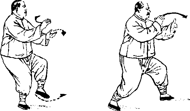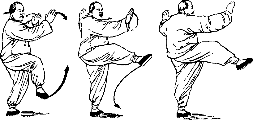2 .两掌合抱交叉后仍须随左腿起立而柔和地向上向外 微移,才显得轻灵、沉着。如果左腿起立时两掌交叉着不动, 就会产生呆滞现象。合抱时两掌腕部不可松懈地弯屈。