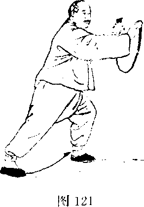 掌心斜朝里上;右掌自右而里向左经左臂上侧向前抹大半个 平圆,即向右前(东南)斜方探出,掌心斜朝左前,指尖斜 朝上。眼神关顾右掌抹转探出。(图120—121)