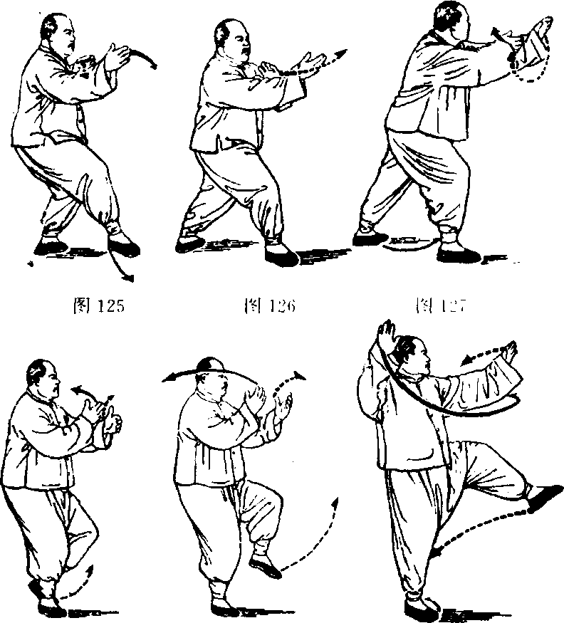 向前抹,随抹随着臂外旋使掌心渐渐翻朝上。(图125) 动作二、三、四同前右分脚动作二、三、四,惟左右式相反, 右分脚方向为东北,左分脚方向为东南。(图126—130)