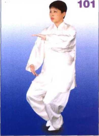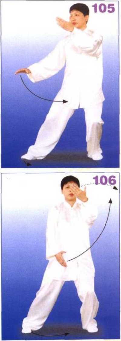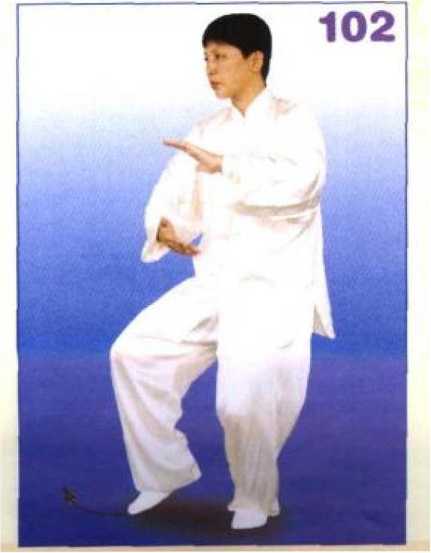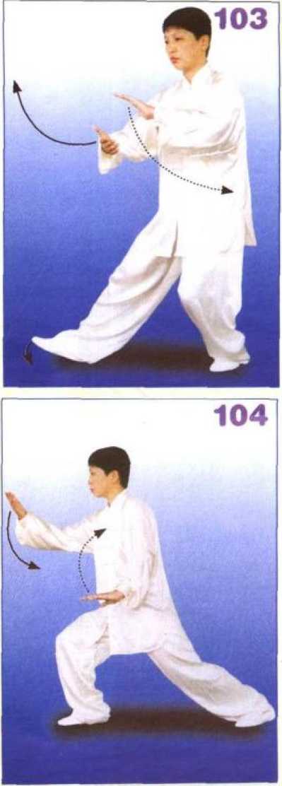 右腿屈膝提起,右腿向前方迈步, 先以脚跟着地,然后全脚踏实,右腿 屈膝前弓,左腿伸直,成右弓步;同 时右掌向前分举,掌心向里,高与胸 平;左掌按于左胯外侧,掌心向下, 两臂均成半圆形;眼看前方。(图 102、103、104)【错误与纠正】① 错误:腰的转动与上肢动作配合不协调。纠正:在转腰的同 时,两臂分开,形成靠采动作。② 错误:前臂的手腕易折腕。纠正:前臂要形成一个整体的外 靠,不能折腕。