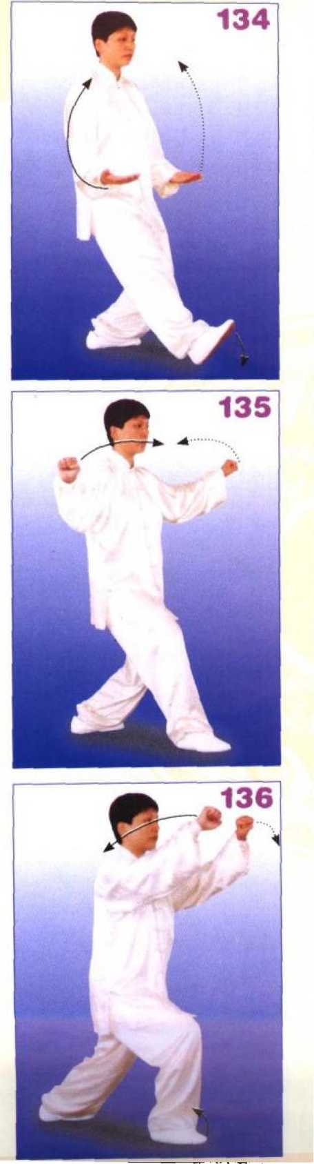 右脚向右前方落步,先以脚跟着 地,然后全脚踏实,右腿屈膝前弓, 左腿伸直,成右弓步;同时两掌变拳 由两侧弧形向右前贯击,两拳眼相对, 高与耳平,两臂均成半圆形;眼看右 前方。(图 134、135、136)