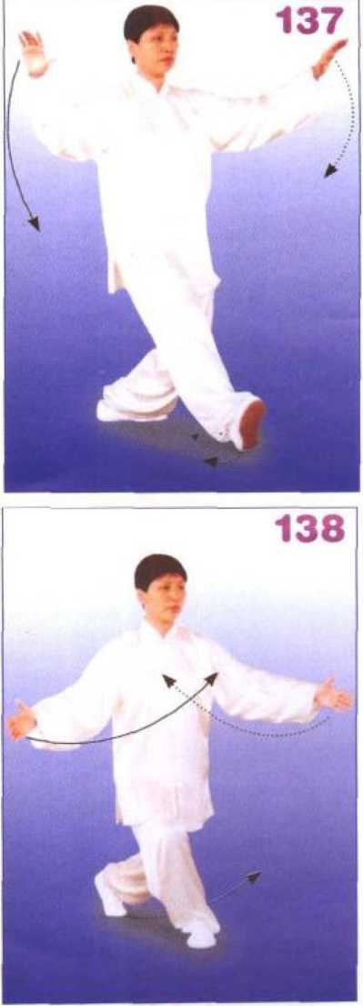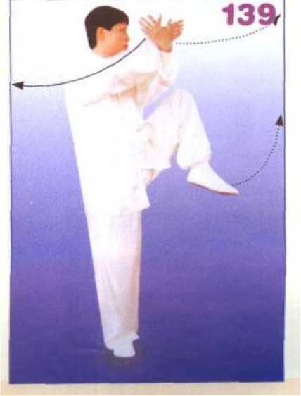 左腿屈膝提起;两掌交叉合抱于 胸前,左掌在外,掌心向里;随即两 掌向左右弧形分举,掌心均向外,掌 指向上,两腕与肩同高;同时左脚向 左侧方分举,脚面自然绷平,腿高与 胯平;眼看左侧方。(图139、140)140【错误与纠正]①错误:膝关节弯曲,踝关节过 松。纠正:分脚时,左腿自然伸直,踝关节处绷脚面,力达脚尖。②错误:分脚时,手臂与腿形成 十字分脚。纠正:分脚时,(左)手臂与(左)腿上下在同一条竖线上。■ 141w