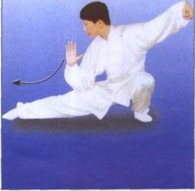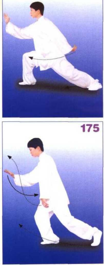 左脚蹬地,重心前移,右腿屈膝 前弓,左腿伸直,成右弓步;同时身 体直起,右掌向前穿举,掌指向前, 掌心斜向下;眼看前方。(图174)