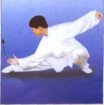 身体左转,左脚尖稍外撇,重心 后移,左腿屈膝下蹲;右脚掌为轴; 脚跟稍外蹬,右腿伸直,成右仆步; 同时左拳变掌由前向下、向后弧形运 至左后方,随即变勾手,右拳变掌由 前向上、向里经右胸向下沿右腿里侧 向前穿出,掌心斜向下,掌指向前; 上体微前伏;眼看前下方。(图171、 172、 173)
