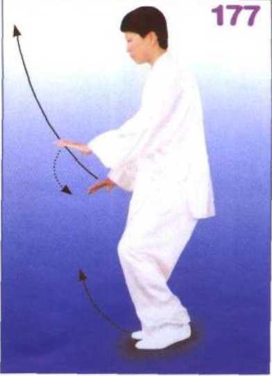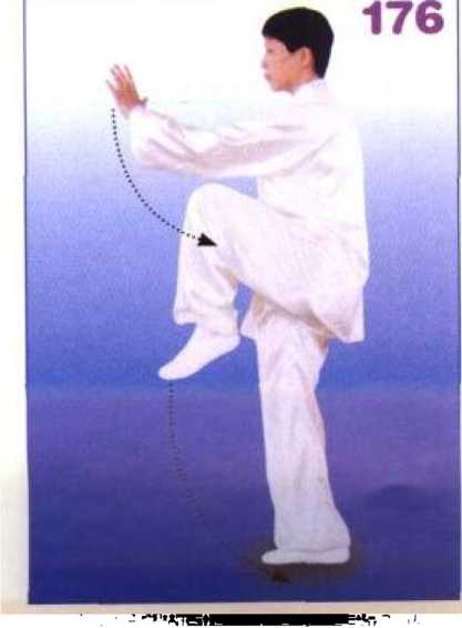 左脚落于右脚里侧,随之右腿屈 膝提起;同时左掌下落至左腿外侧, 掌心向下,掌指向前;右掌由下向前 弧形挑举于前方,臂微屈,掌心向左, 掌指向上,右肘与右膝上下相对;眼 看前方。(图177、178)