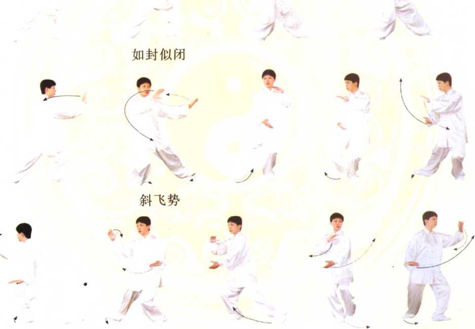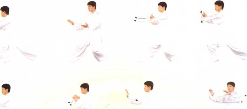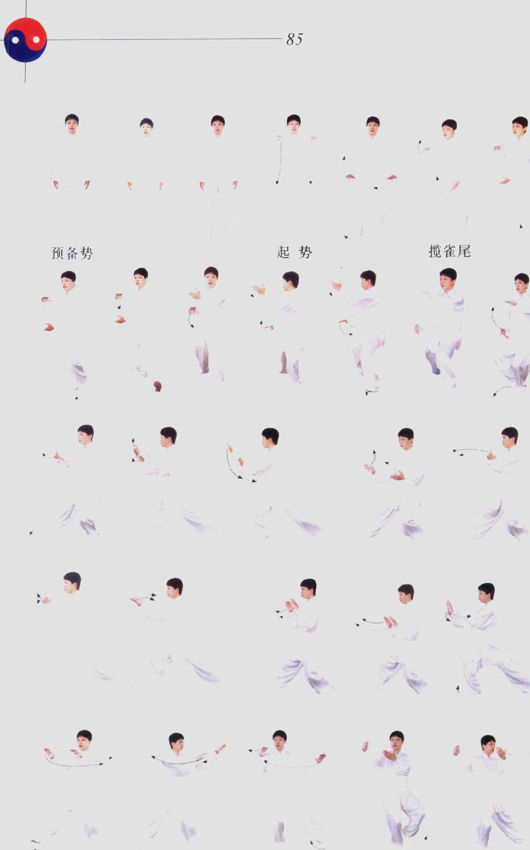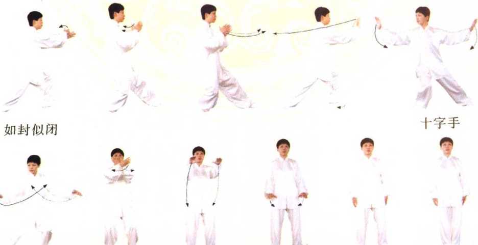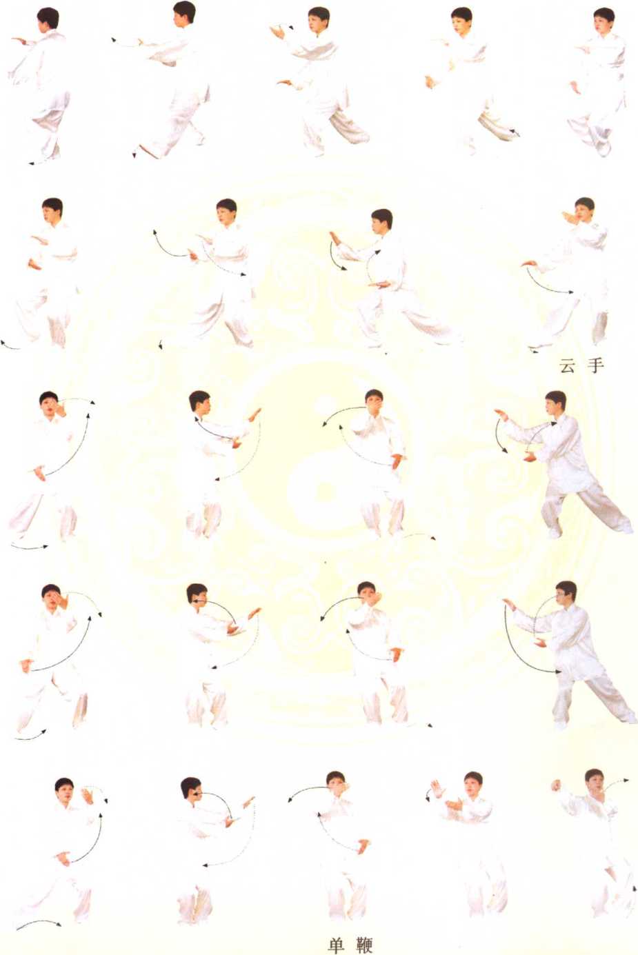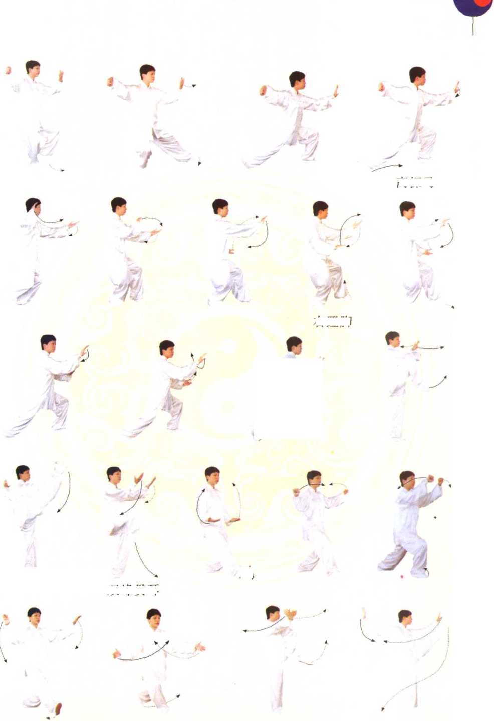 两掌向外翻转,掌心向下,掌指 向前,随即下落于两腿外侧,掌心向 下,掌指向前;左脚向右脚靠拢,成 并步站立;两掌指下垂;眼看前方。 (图234、235、236、237 )o【错误与纠正】错误:身体过于放松。纠正:两 掌下落时,提顶,立身,含胸拔背, 眼看前方。单鞭手挥琵琶倒卷肱左右野马分鬃90右蹬脚左分脚双峰贯耳高探马白蛇商信指裆捶揽雀尾退步跨虎94收势