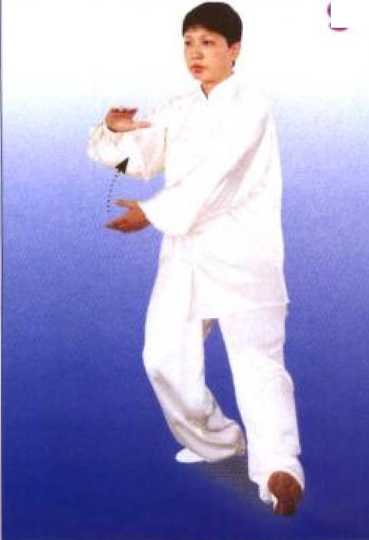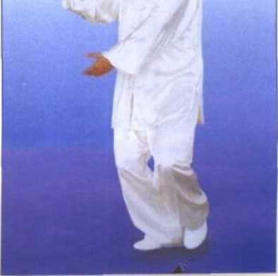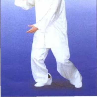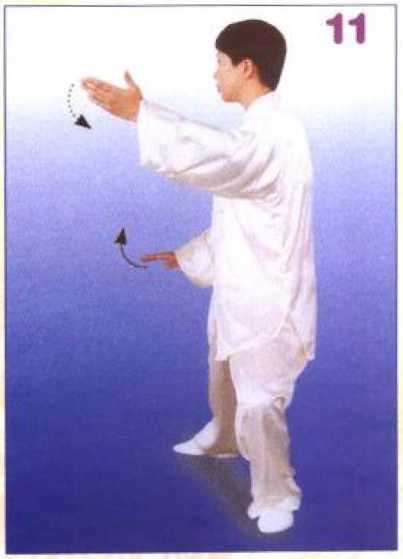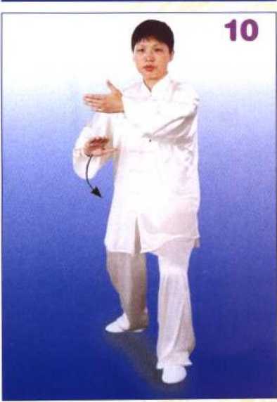 左腿屈膝提起,随即向左前方迈 步;先脚跟着地,然后全脚踏实,左 腿屈膝侧弓;右腿伸直,成左弓步; 同时身体微右转,左掌向左前方才朋出 (即左臂平屈成弓形,用左前臂外侧和 掌背向前丰朋出),左掌与左前臂高与肩 平,掌心向里;右掌弧形按于右胯旁, 掌心向下;眼看右前方。(图8、9、 10、 11)