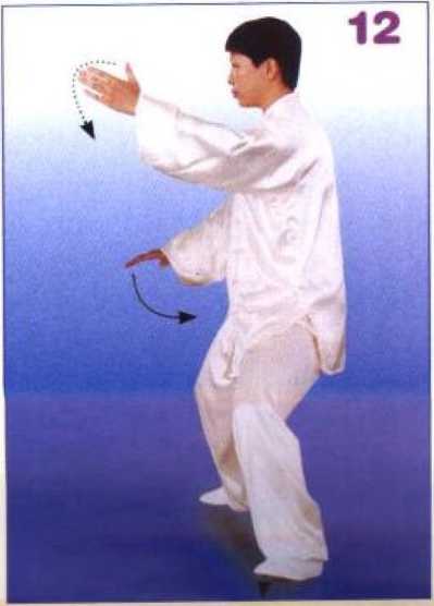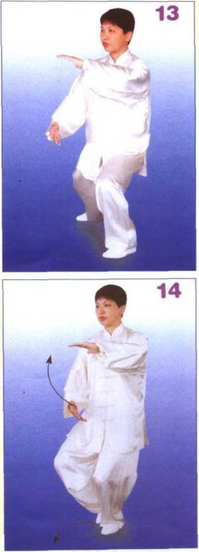 重心右移。左脚尖内扣踏实,随 即重心左移,左腿屈膝侧弓;右腿伸 直,脚跟提起。同时左前臂内旋,掌 心翻转向下;右前臂外旋,右掌由右 向左弧形抄举于身体左侧;左掌在上, 右掌在下,两掌心相对,两臂均成半 圆形;眼看左前方。(图12、13)