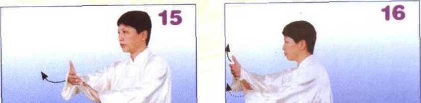 ② 错误:下按时手臂僵直,手腕僵硬,两掌无下按之意。纠正: 下按时,沉肩坠肘,下按的意识集中在掌心,手臂不能伸直,手臂 成下弧形。