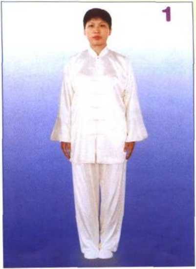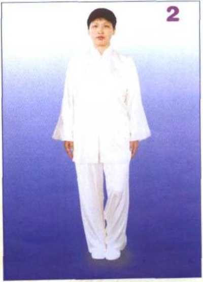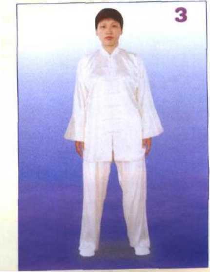 身体自然直立。左脚向左开步, 与肩同宽,脚尖向前;两臂自然下垂, 两手放在大腿外侧;眼看前方。(图 1、2、3)