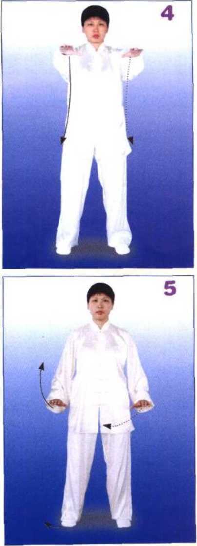 两肘下沉,自然地带动两掌慢慢 向下按至大腿外侧,掌指向前,掌心 向下;.眼看前方。(图5)