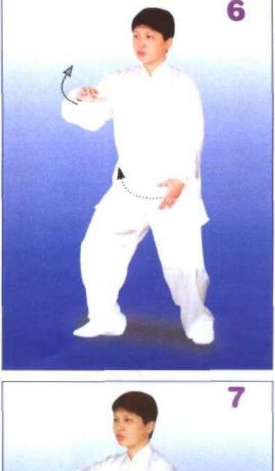 身体微右转;右脚尖外撇,重心 右移;左脚掌着地,脚跟提起;同时 右掌举至右胸前,屈肘,掌心向下; 左掌举至腹前,掌心斜向上;眼看右 前方。(图6、7)