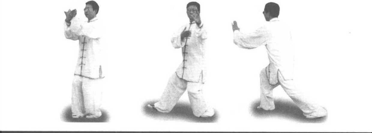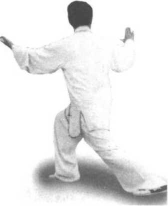 动作要领:(1)双掌运转与迈出步动作协调一致。U)双臂呈弧形,左掌向 体左后侧划弧应在体左后侧45度为宜。(3)迈步时身体重心必须坐实,以保持 身体平衡。(4)右脚迈出时,右膝关节微屈。