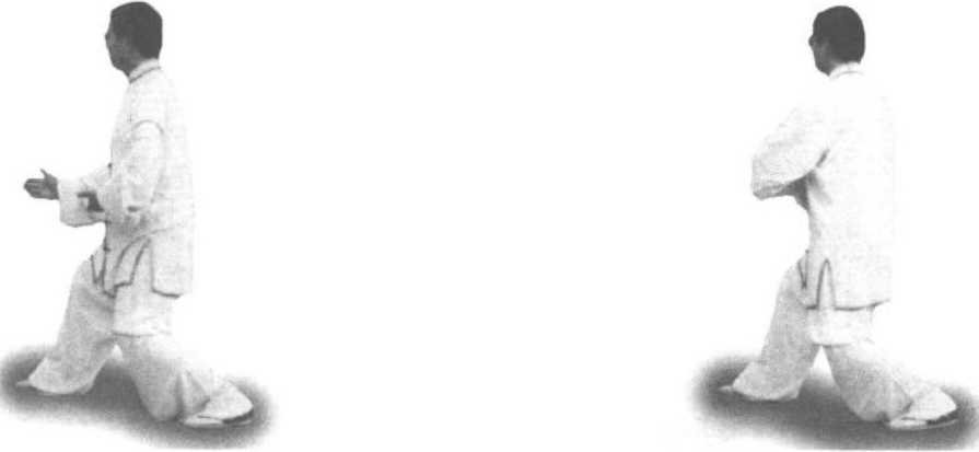 动作2:身体继续向右转,重心于左腿,随体转,右脚提起向右前方迈出, 脚跟先着地;同时右掌微向上划弧经面前落于左肩侧前,掌心向内,掌指向左; 同时左掌翻转掌心向上,向下、向左后上划弧于左肩外,掌心向外,掌指向上; 眼视左手方向(图234)。