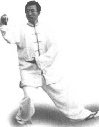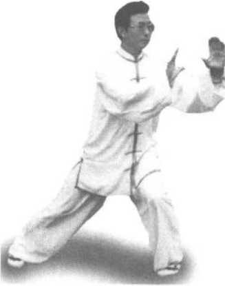 技击含义:身体向右转幅度要适中,重心要移于右腿,左脚迈出动作才能轻 松自如。左膝关节要微屈,不可僵直挺硬。右掌翻转掌心向上,向颌下屈臂回收