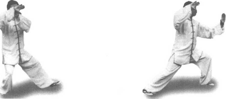 技击含义:此势动作时,双臂的动作与身体的转动,右腿的弓步协调进行。 腰髋的转动带动左掌上提向前的横掌推出,此时意贯左掌外缘及左臂,是撑推的 感觉。同时右掌的回收,意贯右臂下侧,是引带劲。右肘关节,含有向后的顶 劲。虽然身体转动的幅度不是很大,但腰髋的转动,身体沿纵轴运转,使得左脚 的蹬踏之劲,贯穿到双掌。松肩拔背是蓄劲的体现。正如拳谚所云:“擎起彼劲