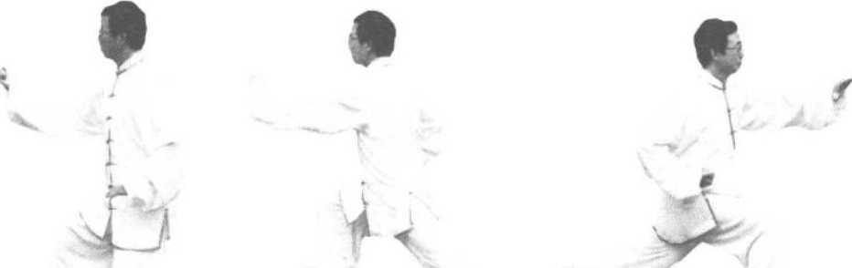 动作要领:(1)腰的转动带动双掌上提、迈步协调完成。(2)立身中正,身 体重心不可起伏。(3)松腰沉髋,松肩沉肘,双臂撑圆。