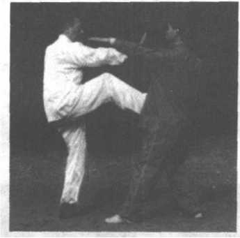3、甲右手旋入乙左臂内侧,掌向里翻,发劲;同时,起右 脚,蹬或踢乙腹部° (图12796)