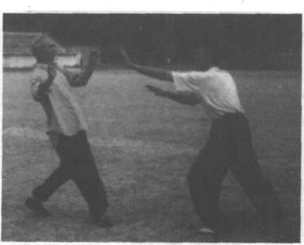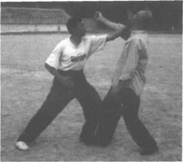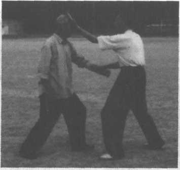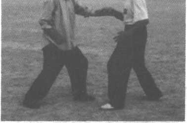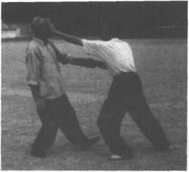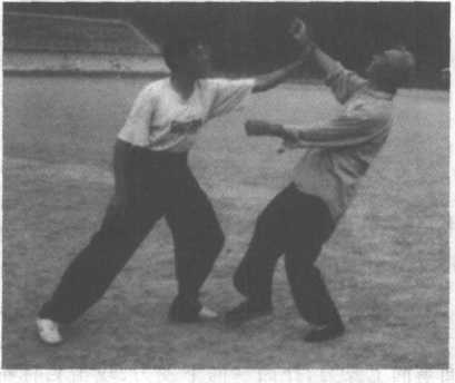 迎面掌向上发力,扑面掌向下发力,攻击目标都是面部。 扑面掌上穿下扑示范如下:1、甲出左拳,击乙胸部。乙伸右手,下按,接甲左拳。(图 12-116)图 12-114图 12-115图 12-1162、乙随即左掌上穿,抚甲头部。(图12-117)图 12-1173、乙急翻左掌,向下扑甲面。(图12-118)H 12-1184、乙左掌发力,将甲击出。(图12—119)图 12-119