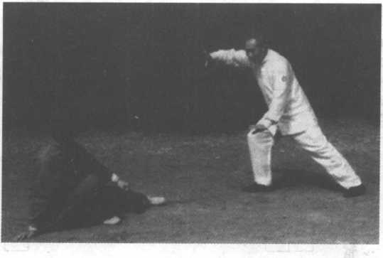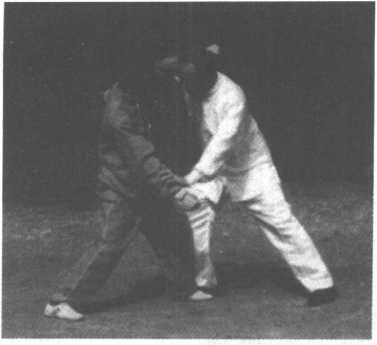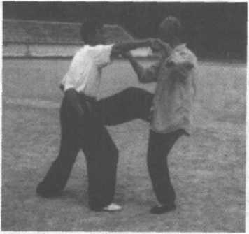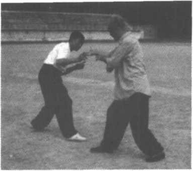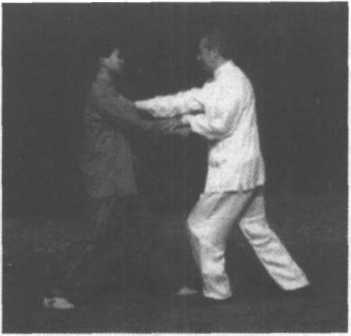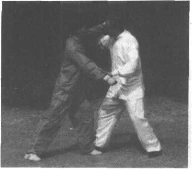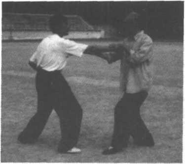 3、甲左手探乙右小臂,右臂上抬乙左臂;向左前方俯身, 发力,将乙击倒于左前方。(图2-136、137)这一动作极似 “弯弓射虎”状,故称之“弯弓射虎”。