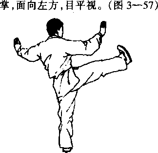 7 .蹲而后起。右脚蹬地,提左膝,垂小腿,抬脚向左方分 脚踢出。同时两臂外展,左臂顺左腿踢出方,右臂向右前方, 掌心向外,指尖朝上。意在左脚和左掌,面向左方,目光从左 肩之上向左方平视。(图3—60)
