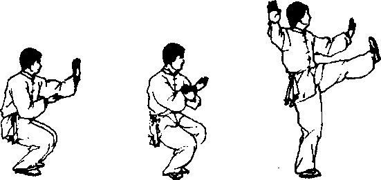 3 .蹲而后起。左脚蹬地,提右膝,垂小腿,抬脚向左方分 脚踢出。同时两臂外展,右臂顺右腿踢出方向,左臂向右后 方,掌心向外,指尖朝上。意在右脚和右掌,面向左方,目光从