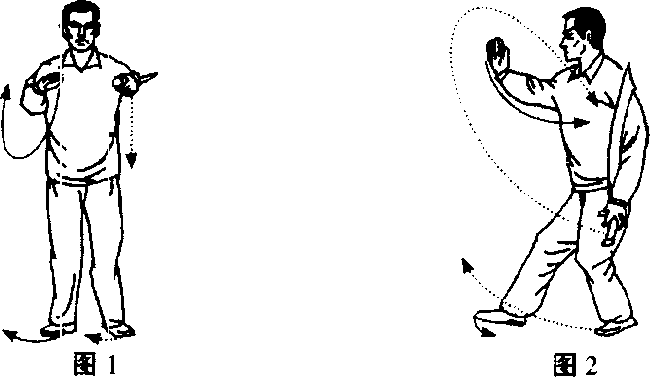 坐实承担全身体重,同时撇右足向西略翘起与地面不超过45度 角,右足膝松屈成太极势。在动脚之同时双臂左里右外环抱在胸 前,身向右转,右掌指舒展向上抬起,手心向里,五指朝南,臂 呈半圆形,捧刀左手经右小臂内渐渐落下至左腿外侧,依旧刀尖 朝天,目光透过右手食指眺及远处。(图2,胸向西南)