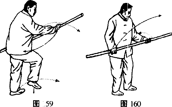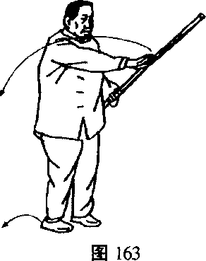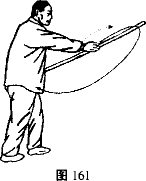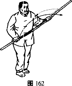 1.里扣左足,右转腰,右手棍上滑后向下停右胯旁,左手 棍则随之向东南打去,右弓步3 (图162)